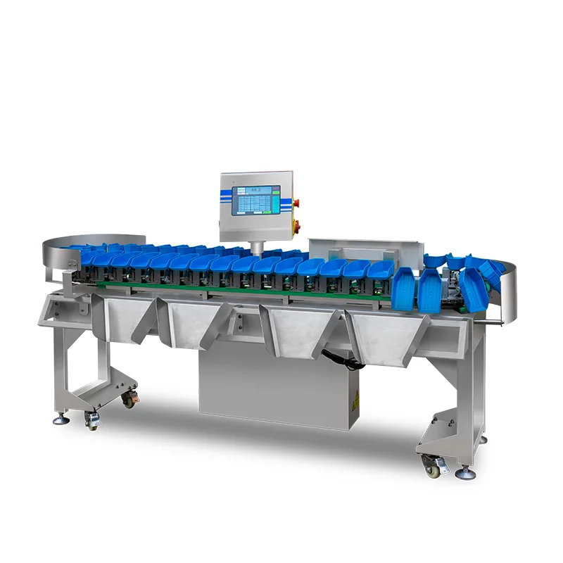 The Rotating Trays Weight Grader is designed for precise sorting and grading based on weight, utilizing rotating trays for efficient product handling. This system ensures uniform distribution and accurate weight classification, making it ideal for high-speed food processing applications.